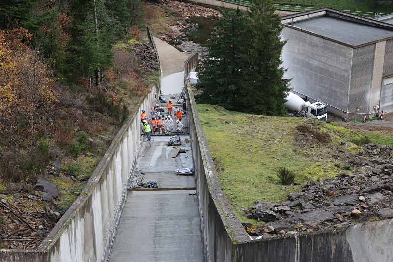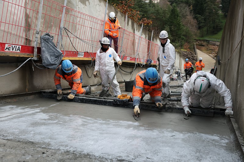 Pour éviter d’en arriver là, Saint-Étienne Métropole entreprend donc des travaux de réfection intégrale de l’évacuateur de crue. En clair, il s’agit de reprendre la dalle béton actuelle en projetant un béton spécifique, qui comprend des fibres métalliques qui le rendent plus résistant à l’abrasion.